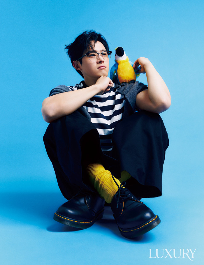 스트라이프 셔츠와 피케 셔츠는 마리떼 프랑소와 저버. 에비에이터 디자인의 뿔테 안경은 보테가 베네타 by 케어링 아이웨어.