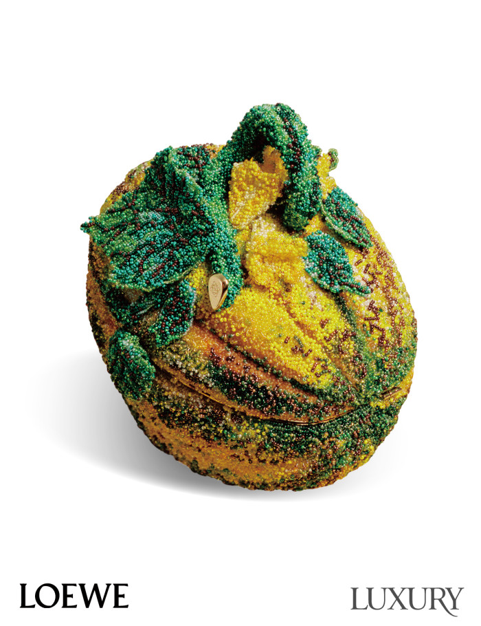 로에베, ‘멜론’ 백 2024년 가을·겨울 여성 컬렉션에서 선보인 클러치백으로, 작은 비즈와 레진을 빼곡하게 채워 완성했다. 로에베 특유의 장인 정신이 고스란히 느껴지는 제품. 열매의 주름 하나하나와 덩굴, 이파리, 흙이 묻은 부분, 색깔까지 정교하게 살려 마치 금방이라도 나무에서 떨어진 듯 생동감이 넘친다.