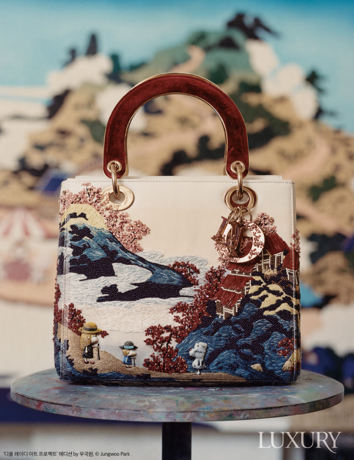 구름을 끼고 있는 병풍처럼 펼쳐진 산 아래 오솔길을 밀짚모자를 눌러쓴 작은 여인과 아이가 지팡이를 쥐고 걷고 있다. 그들을 내려다보고 있는 언덕 위 붉은 기와집 위로 비즈로 만든 흐드러진 벚꽃과 꽃나무가 여행자들을 환영하는 듯하다. 멀리서 보면 채색 산수화 같은 인상을 주지만, 실제로는 자수와 비즈로 이루어진 이 동화 같은 풍경은 작가 우국원이 ‘디올 레이디 아트 프로젝트’의 아홉 번째 에디션에 참여하며 선보인 작업이다. 그는 이 프로젝트를 통해 미디엄 사이즈의 백 2점과 스몰 사이즈 2점, 마이크로 버전 1점까지 총 5점의 작품을 선보였다. 검은 가죽이 밤하늘이 되고, 그 위로 빼곡하게 박힌 크리스털과 비즈가 별이 되는 작품은 그 아래 잔디 언덕에 누워 별을 바라보는 여자와 아이 그리고 강아지의 모습이 한 편의 동화를 떠올리게 한다. 구상적 요소에 팝아트적인 미학을 더하는 우국원의 작업은 늘 그렇듯 허구와 현실 사이에서 가장 사랑스러운 방식으로 자신의 이야기를 들려준다.