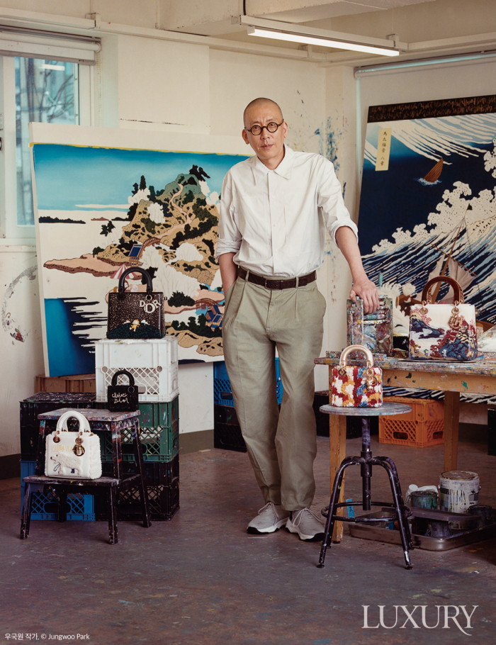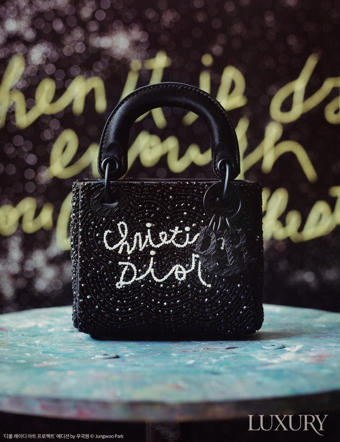 ‘디올 레이디 아트 프로젝트’는 올해로 9회를 맞았다. ‘레이디 디올’ 백이라는 하우스의 상징적 아이콘을 예술가의 시각에서 재해석하는 이 흥미로운 작업은 2016년 디올의 크리에이티브 디렉터 마리아 그라치아 키우리의 주도하에 출범한 프로젝트다. 매년 전 세계 다양한 아티스트들의 손을 거쳐 재해석되는 레이디 디올의 새로운 모습은 오래된 아이콘에 신선함을 불어넣고, 전통과 권위를 더욱 공고히 하는 역할을 하고 있다. 2016년 아트바젤 마이애미에서 마크 퀸을 포함한 7명의 작가가 참여한 첫 번째 에디션을 발표한 뒤로 ‘디올 레이디 아트 프로젝트’는 줄곧 패션과 예술의 완벽한 협업을 상징하며 신선한 반향을 일으켜왔다. 프로젝트에 참여해온 다양한 아티스트들의 작업 과정과 그 결과물은 레이디 디올의 가능성을 무한대로 확장했다. 2025년 아홉 번째 에디션 작업에 참여한 작가는 한국의 우국원 외에 대니얼 매키니Danielle Mckinney, 주이 아인 냔 죽Duy Ahn Nhan Duc, 리앙유안웨이Liang Yuanwei, 본 스팬Vaughn Spann, 사라 플로레스Sara Flores, 애나 웨이언트Anna Weyant, 제프리 깁슨Jeffrey Gibson, 페이스 링골드Faith Ringgold, 하얄 포잔티Hayal Pozanti, 황유싱Huang Yuxing까지 모두 11명. ‘디올 레이디 아트 프로젝트’에 처음으로 합류한 한국인 아티스트는 2023년 일곱 번째 에디션 제작에 참여한 김민정 작가다. 우국원은 지난해 8회 에디션에 참여한 하종현, 이건용에 이어 레이디 디올을 재해석한 네 번째 한국 아티스트로 이름을 올렸다.