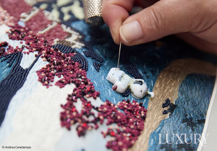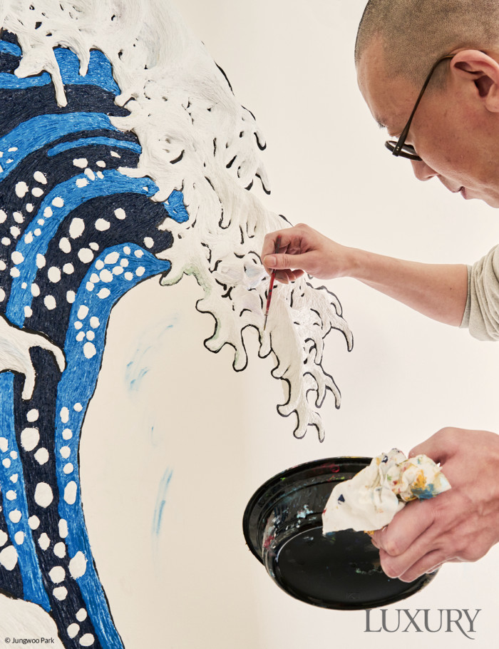 그간 유화 작업과 드로잉을 위주로 한 작업을 선보여온 우국원은 “물감을 가지고 노는 것을 즐긴다. 작업을 하면서 물감으로 할 수 있는 것은 모두 다 시도해보고 있다”라고 직접 밝혔을 정도로 회화적 실험에 계속해서 도전하고 있는 인물이다. 이번 프로젝트에서 백 에디션만이 아니라 순수 회화 작품도 함께 공개한 그는 물감을 두껍게 쌓아가거나 긁어내면서 마티에르를 적극적으로 활용한 작품을 통해 고유의 스타일을 드러냈다. 패션 또한 사람들에게 가까운 예술의 한 장르로 느껴진다는 작가는 이번 작업을 통해 자신이 시도하고 있는 다양한 회화적 실험과 새로운 스타일을 레이디 디올에 반영했다. 물감으로 채색할 수 없는 것들을 자수와 비즈로 표현했고, 이전의 그 무엇과도 다른 질감으로 레이디 디올을 재탄생시켰다. 그야말로 레이디 디올의 ‘뉴 룩’인 셈이다.