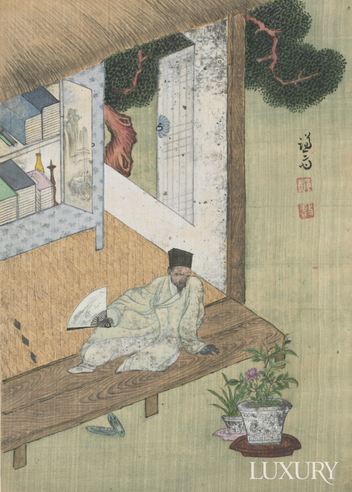 정선, ‘독서여가도’, 1740~1741, 비단에 채색, 24.0x16.8cm, 간송미술문화재단 소장. 사랑방 앞 툇마루 위로 한 선비가 앉아 청화백자 화분에 심은 붉은 해당화를 바라보고 있다.