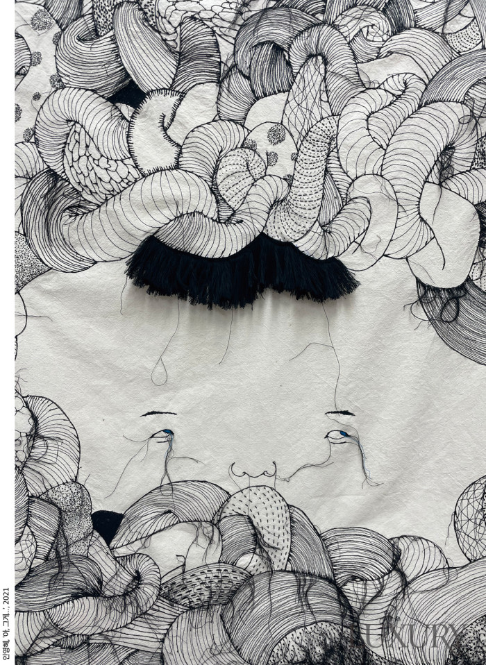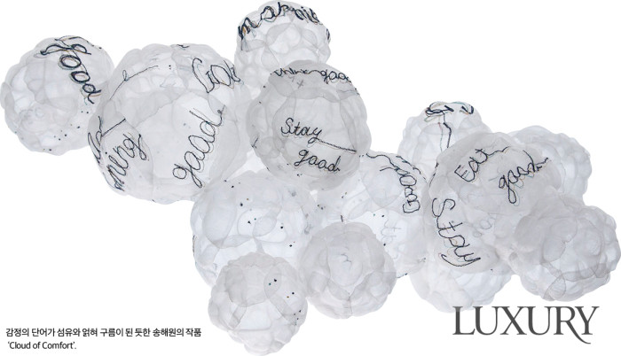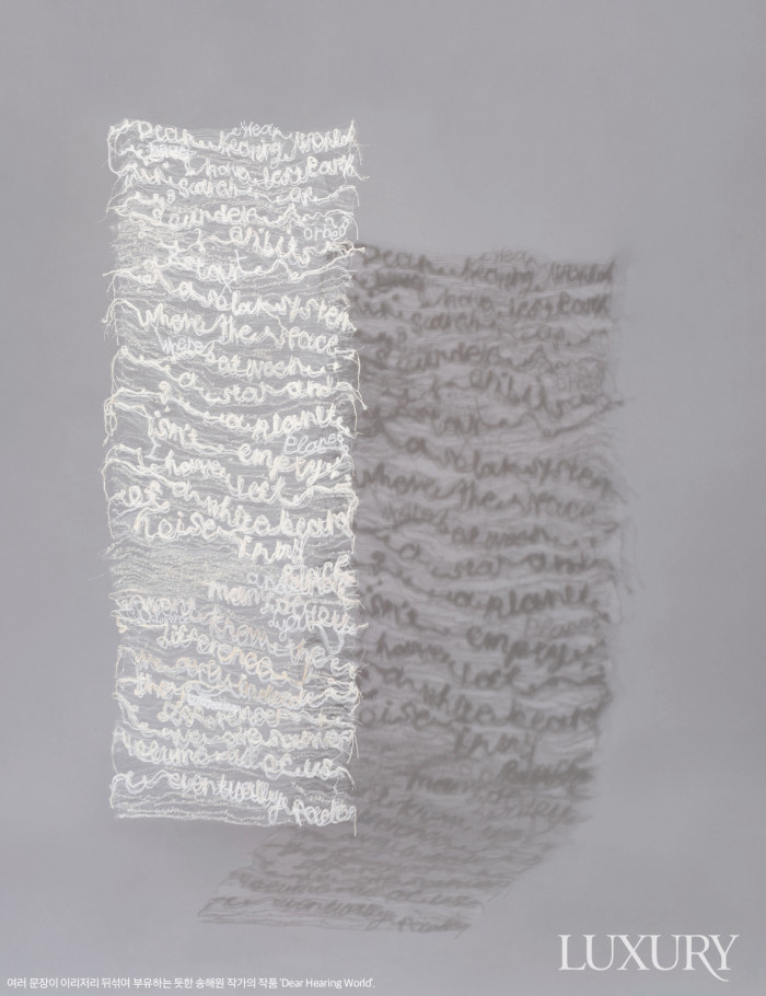 “재봉틀 소리가 청각을 자극하고, 이 소리는 이내 실속에 서서히 스며든다. 실로 표현한 텍스처에 드리운 일련의 단어들은 섬유 망에 걸려든 감정의 포획물이다. 때로는 섬유와 얽힌 이 단어들이 넓고 넓은 바다 한가운데의 부표가 안정감을 주듯이 내게는 따뜻한 위안이 된다.” 작가 노트에서 엿볼 수 있듯 송해원 작가가 비치는 패브릭을 실로 자유자재로 재봉한 섬유 조형물은 작가 주변을 둘러싼 기억, 보이지 않는 감정을 대변한다. 이를 위해 프리모션 스티치와 패브릭 머니퓰레이션 기법으로 선과 선 그리고 면과 면을 이어 작품에 입체감을 부여했다. 특히 작품에서 엿볼 수 있는, 글의 윤곽선을 형상화한 자수 패턴의 이미지는 작가 내면의 시어를 의미하는 것이며, 고요 속에서 삶을 이어가고픈 열망을 표현한 것이라고.