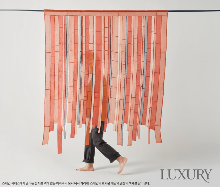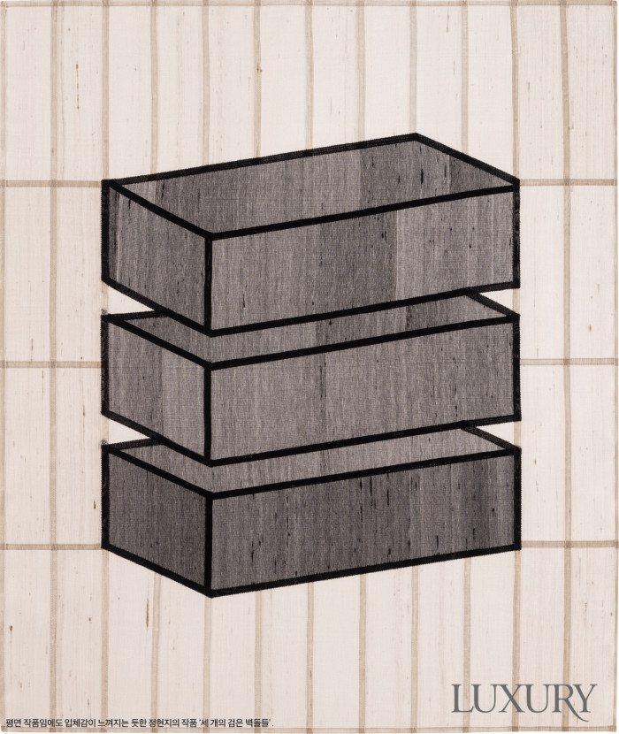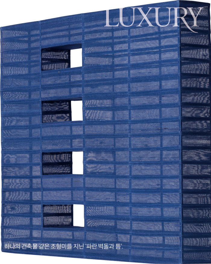 작가는 전통 규방 공예의 기법을 현대적인 방식으로 재해석한다. 특히 조각보 제작 기법을 활용해 평면적인 섬유의 구조를 건축적인 입체 형태로 치환하는 데 집중한다. 이때 사용하는 것이 바로 ‘쌈솔’ 기법이다. 씨실과 날실의 결을 따라 반복적인 라인을 형성하고, 감침질을 통해 구조적인 입체감을 만들어내는 것. 공간, 건축적 요소는 그의 작업을 관통하는 주요 키워드이며 ‘벽돌’은 이를 대변하는 매개체가 된다. 벽돌이 모여 이루는 건축물은 평면과 입체로 자유로이 변형된다는 점에 착안해 자신만의 조형 언어를 가미해 이를 작품화하는 것. 주로 한국 전통 한복에 사용되는 명주를 활용하는데, 소재 특유의 반투명한 질감과 쌍고치의 불규칙한 결이 빛과 공간 속에서 변화하는 구조를 만들어내는 모습이 독특하다. 그의 작업이 단순한 섬유 조형을 넘어 전통과 현대, 평면과 입체의 접점을 탐구하는 과정으로도 읽히는 이유다.