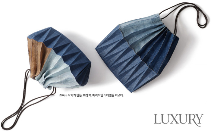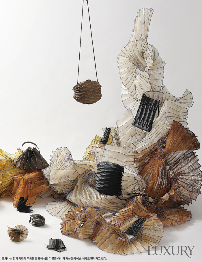 조하나는 전통 규방 공예의 주요 기법 중 하나인 ‘접기’ 그리고 이 기법을 통해 탄생하는 주름을 활용해 가방이나 장신구 등의 생활 예술품과 조형 작품을 만든다. 이를 작가는 옛 여인들의 예술적 혼을 되살리는 일련의 행위이자 전통과 현대를 이어주는 연결 고리라 표현한다. 접기 기법은 실첩, 빗접, 쌈지, 종이 등, 병풍, 부채, 식지보, 주머니, 갈모 등 종이나 천을 접어 만드는 생활 용품이나 승경도, 딱지치기, 동서남북, 칠교, 지화, 고깔, 지방 등 유희적 또는 주술적 용도의 기물의 모습을 떠올리면 이해가 쉽다. 작품 제작 과정에서도 작가가 주창하는 가교적 측면을 엿볼 수 있다. 염색한 바탕감을 자르고 손바느질해 덧대어 잇는 데에서는 전통의 자취가 느껴지는 반면, 접기 기법으로 완성한 절제된 주름의 선에서는 세련된 현대의 인상이 전해지기 때문.