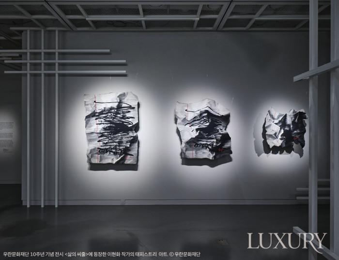 서양화를 전공한 이현화 작가의 섬유 작업은 태피스트리의 회화적인 표현력에 매료된 순간 시작됐다. 자수와 염색, 직조 등 섬유의 여러 표현 방식이 있지만, 태피스트리를 통해 인간 내면을 시각적으로 구현하고 마치 한 폭의 추상화를 보는 듯한 감상을 전할 수 있었기 때문. 작가는 태피스트리의 전통 고블랭 기법을 주로 활용하는데, 긴장된 날실에 정교하게 씨실을 직조해 인간 존재에 대한 심연의 이야기를 엮어낸다. 최근 작업 주제는 ‘영혼의 제의’로, 부정한 것들을 모두 태워 보내고 내면의 정화를 기원하는 의미가 담긴 것이 특징. 태피스트리 조각으로 이루어진 돌탑 형태의 ‘기원의 돌’, 머리카락을 태운 재가루와 소금 결정, 콩테로 그린 회화 작업 등 재료의 근원적인 상태를 고민하고 실험하며 다양한 재료를 섬유와 함께 풀어내는 점 역시 주목할 만한 요소다.