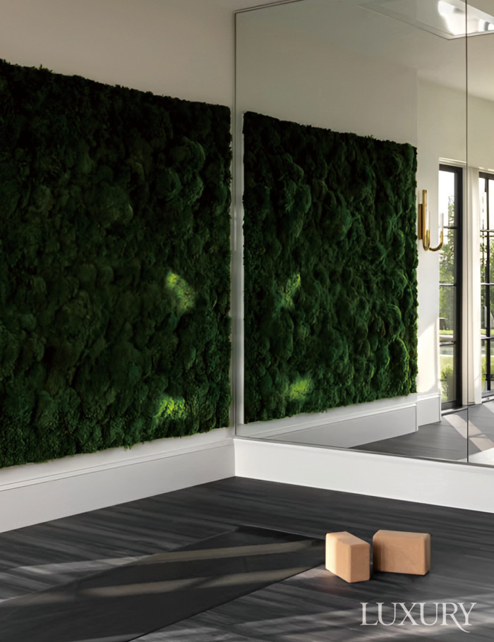아무도 없는 자연 속에서 마음을 정갈히 다스리며 심신을 단련하는 로망을 십분 체험할 수 있는 아이디어도 있다. 공간 스타일링과 가구를 제작하는 ‘웰×디자인Well × Design’의 리더 로렌 설리번은 평소 취미인 핫 요가를 위한 홈 짐의 한 벽면에 살아 있는 자연을 들였다. 벽 사이즈에 맞춤 제작한 패널에 이끼를 식재해 이색적인 매력을 살린 것. 처음부터 식물이 가득한 요가 공간을 구현하고자 했지만, 도리어 인테리어 포인트로 자연을 들여 더욱 아이코닉한 홈 짐이 됐다.