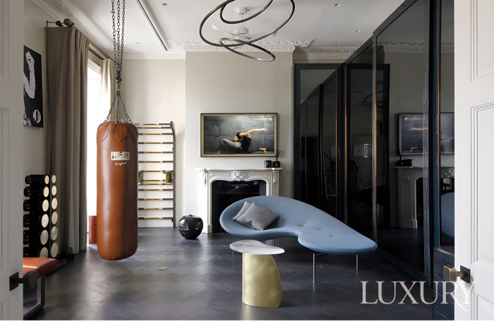 공간이 유연해진다면? 영국 인테리어 디자이너 줄리엣 바이른Juliette Byrne은 상상을 현실화했다. 업무와 운동을 모두 수행할 수 있는 공간을 만들어달라는 클라이언트의 의뢰에 공간을 구성하는 대부분의 요소가 모두 이동 가능하도록 꾸린 것. 벽면 전체를 슬라이딩 도어로 교체하고, B&B 이탈리아의 ‘에다 마메Eda Mame’ 소파나 럭스폼의 ‘타이달’ 사이드 테이블처럼 가볍거나 다용도성이 있는 가구를 배치했다. 하이라이트는 평소 이동 동선을 파악한 뒤 천장에 레일을 깔고 체인을 달아 펀치 백을 자유롭게 옮길 수 있게 한 점. 공간을 차지하지 않고 운동 물품을 보관할 수 있는 웨이트 랙을 설치한 모습도 눈길이 간다.