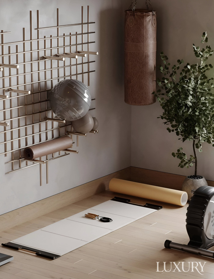 크고 작은 각종 운동 기구를 보관하는 것 역시 나만의 피트니스 공간을 꾸려가는 데 최우선적으로 해결해야 할 과제 중 하나다. 두바이의 인테리어 디자이너 에스라 엘레만Esraa Eleman은 멋스러운 디자인의 웨이트 랙이 실용성과 심미성을 고루 충족시켜줄 것이라 말한다. 마이애미의 해변가 집을 인테리어할 당시 그가 적용한 사례를 보면, 직접 디자인한 젠 스타일의 웨이트 랙이 가장 먼저 시선을 끄는 키 아이템으로 자리하고 있음을 볼 수 있다. 반복적으로 교차하는 스틸 프레임이 조형적인 동시에 크고 작은 운동 기구를 보관할 수 있다는 점이 영리한 아이디어로 읽힌다.