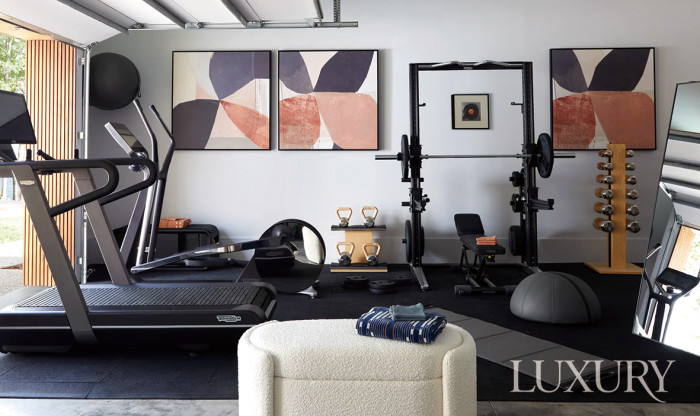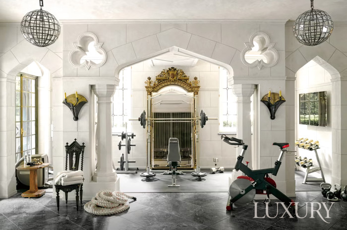 흔히 떠올리는 홈 짐 인테리어의 필수 요소라 함은 벽면을 가득 채우는 전신 거울, 보디 컨디션 체크를 위한 조명, 통풍과 채광 환경일 테다. 이 모든 요소에 자신만의 인테리어 스타일을 가미한다면? 아르데코 스타일의 인테리어가 주무기인 인테리어 디자이너 켄 풀크Ken Pulk는 마치 궁전을 연상시키는 맥시멀리즘 홈 짐을 완성했다. 벽면에 금박 아르데코 장식이 달린 거울을 배치하는가 하면, 기존에 자리하던 아치형 벽에 조형성을 강조한 월 램프와 펜던트 램프를 매치해 단순 홈 짐이 아닌 자신만의 취향이 가득한 스타일 룸으로 탈바꿈했다.