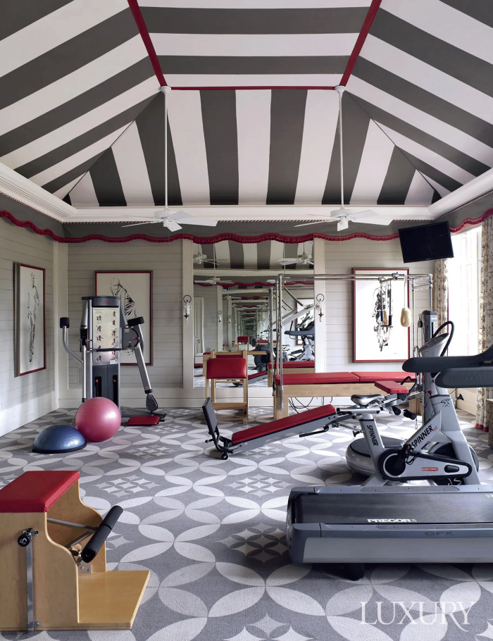 집 안에서 가장 활동적인 공간이 바로 피트니스 룸이다. 거실이나 침실, 다이닝룸과는 달리 과감한 인테리어를 시도해봐도 좋다는 의미다. 미시시피의 공간 스타일리스트 리처드 키스 랭엄이 제안하는 사례는 패턴 하나만 적용하더라도 차분하던 공간에 활기를 불어넣을 수 있음을 보여준다. 바닥에는 기하학 그래픽 패턴을 적용한 듀칸Durkan의 카펫을 깔고, 동시에 천장에는 마치 서커스 텐트처럼 로모Romo의 줄무늬 원단을 둘렀다. 모든 운동 기구에 레드 컬러 포인트를 주어 멋스러움을 살린 점도 아이디어다.