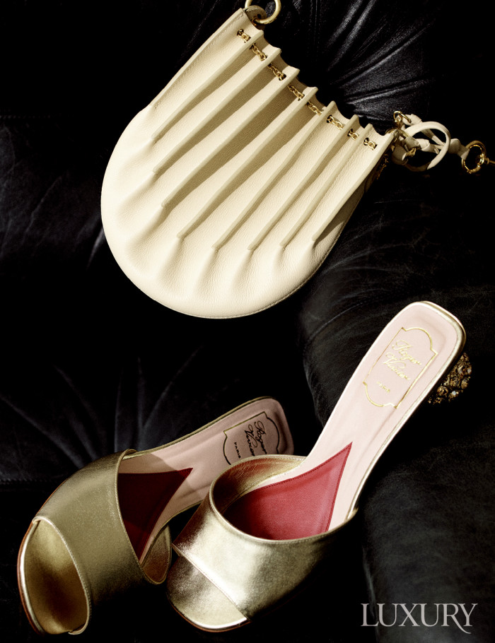 조개에서 영감받은 형태의 크로스 보디 백은 끌로에. 크리스털을 세팅한 힐이 돋보이는 뮬은 로저 비비에.