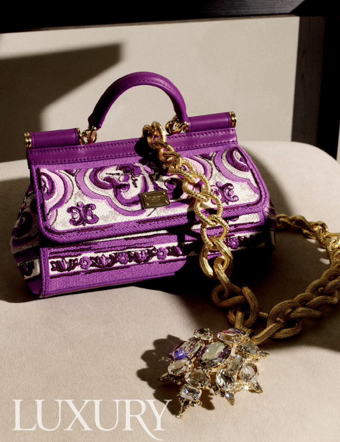 비즈를 엮어 만든 네트 비니는 큐 밀리너리. 이국적인 마졸리카 문양을 장식한 톱 핸들 백은 돌체앤가바나. 화려한 크리스털 장식의 네크리스는 발렌티노 가라바니.
