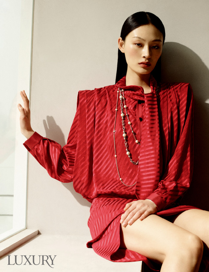 파워 숄더 블라우스와 언밸런스 스커트, 진주와 메탈 소재의 롱 네크리스 모두 루이 비통.