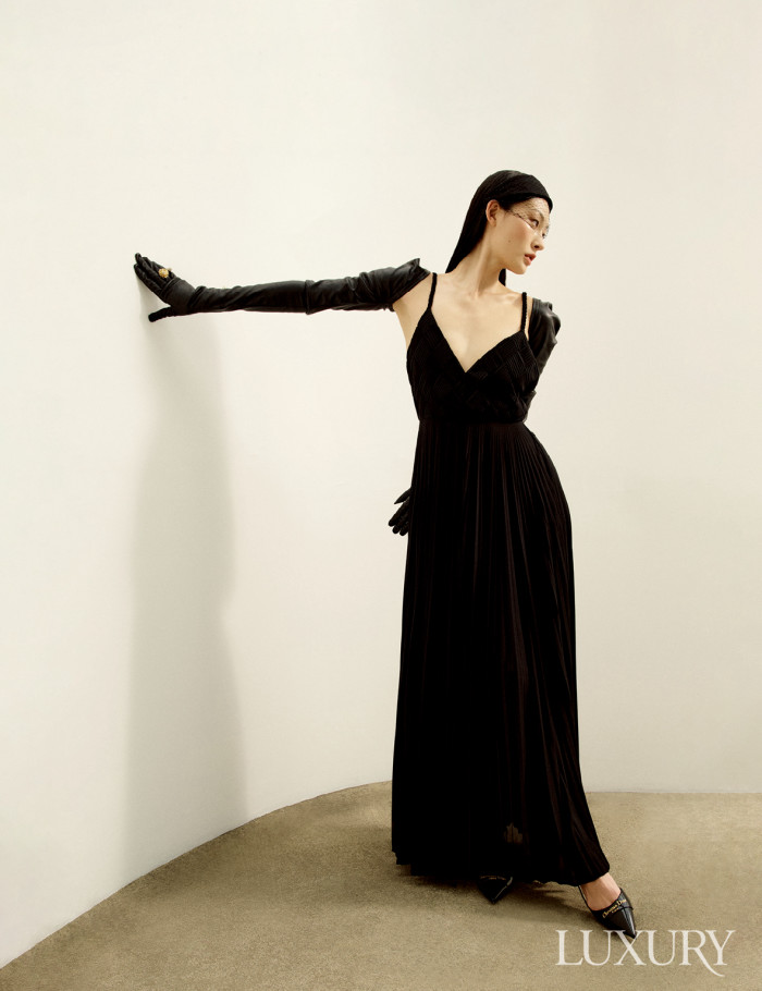 블랙 뷔스티에 드레스와 롱 가죽 글러브, 슬링백 슈즈 모두 디올. 더블 핑거 플라워 링은 로저 비비에. 패시네이터 헤어밴드는 브라운햇.