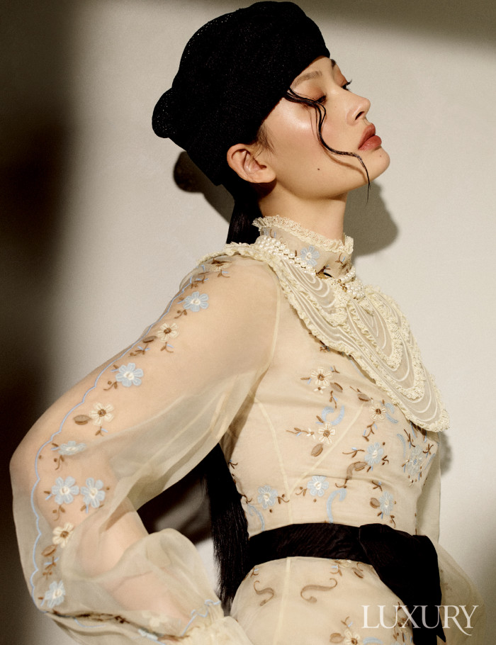 플로럴 시폰 드레스는 발렌티노. 리본 벨트와 세 줄 진주 네크리스는 발렌티노 가라바니. 리본 터번은 어썸니즈.