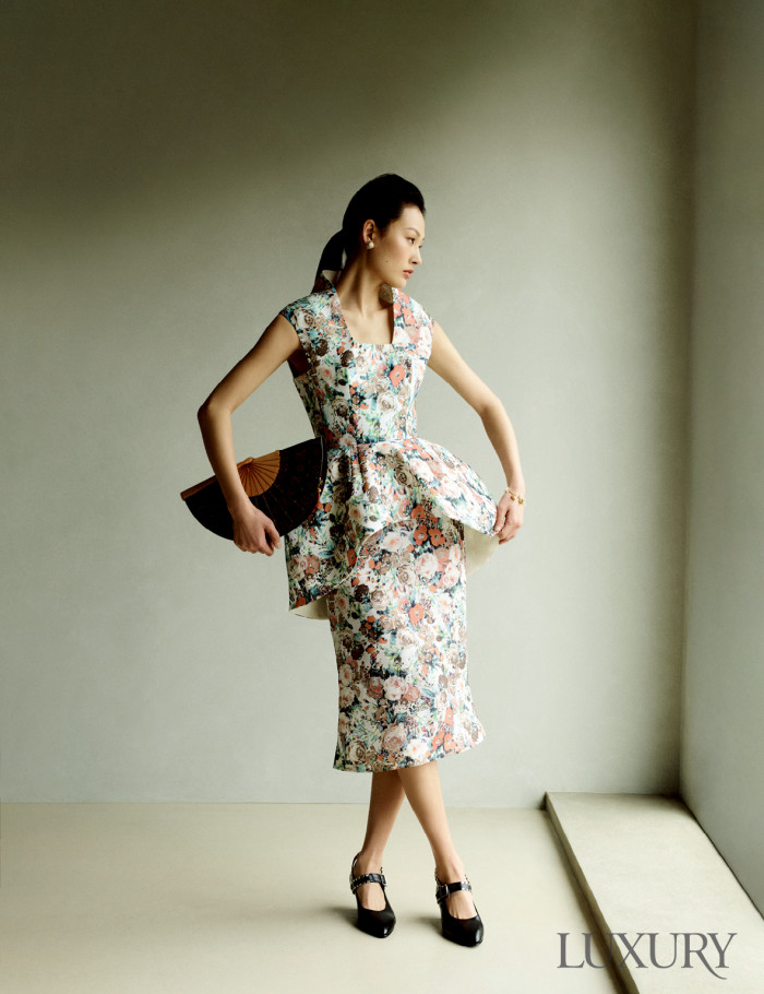 페플럼 디테일을 더한 플라워 패턴 드레스와 스터드 장식의 메리 제인 슈즈 모두 발리. 골드 크리스털 볼 이어링은 셀린느. 부채 모양의 클러치백은 루이 비통.