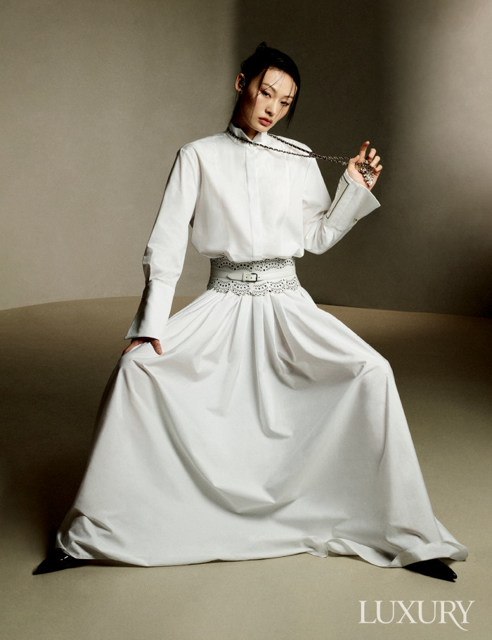 화이트 셔츠 드레스는 에르뎀. 코르셋 벨트는 알라이아. 슬링백 슈즈는 셀린느. 깃털 모티프의 이어 커프와 타이 네크리스 모두 샤넬.
