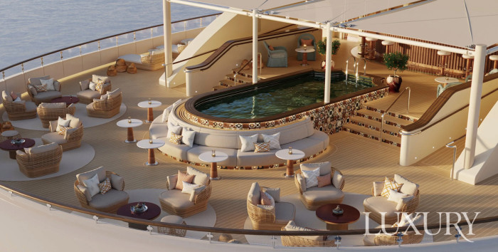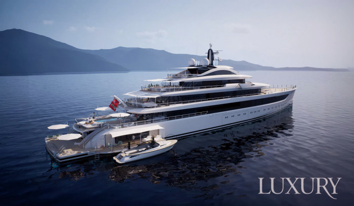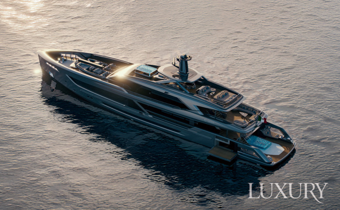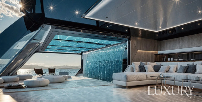 이탈리아 디자이너 마우로 잠보이Mauro Giamboi가 선보인 ‘액시엄 40’은 쌍동선(2개의 선체를 갑판 위에서 결합한 배) 형태의 ‘해상 거주 플랫폼’이다. 눈길을 사로잡는 건 120㎡ 규모의 워터폴 비치 클럽. 삼면 개방 구조, 투명 풀 바닥 위로 쏟아지는 자연광, 접이식 사이드 테라스, 쌍동선 사이에 감춰진 인공 폭포가 어우러져 공간에 극적인 효과를 더한다. 오너 스위트는 55㎡ 크기로 전용 오피스와 테라스, 스파 스타일 욕실을 갖췄고 메인 살롱은 라운지, 포멀 다이닝, 바를 포함한 오픈 플랜 구조로 구성된다. 액시엄 40은 최대 16노트(약 30km/h)의 속도와 항속거리 3500해리(약 6500km)를 갖춘 디젤-전기 하이브리드 구조를 채택해 지속 가능성을 잡았으며, 서비스 효율을 고려해 덤웨이터dumbwaiter(소형 수직 엘리베이터 시스템)도 설치했다.