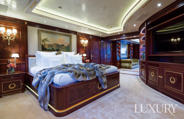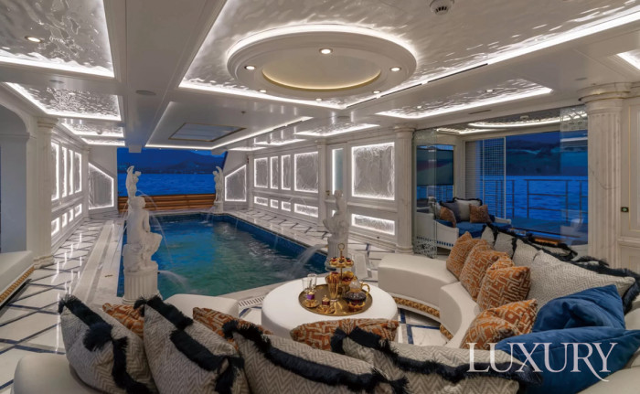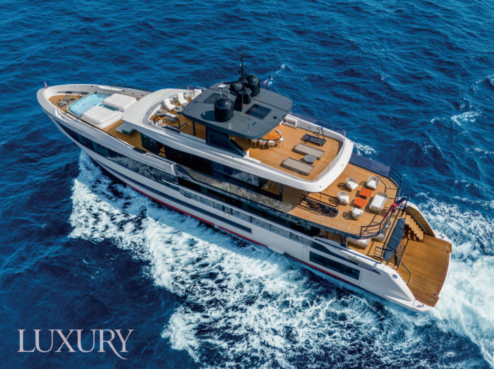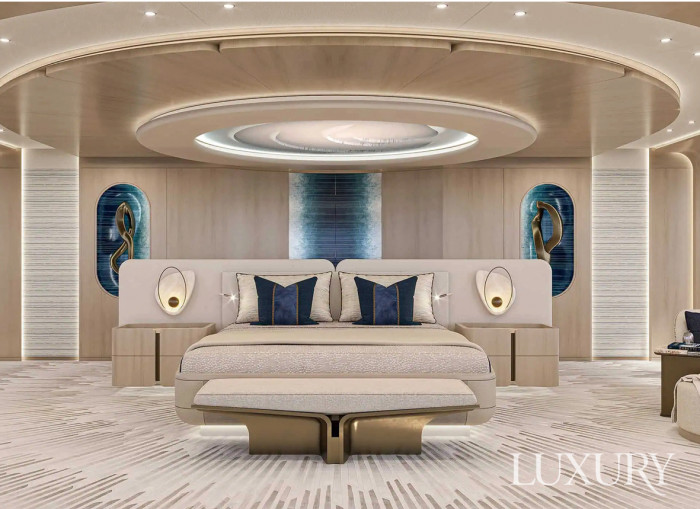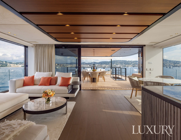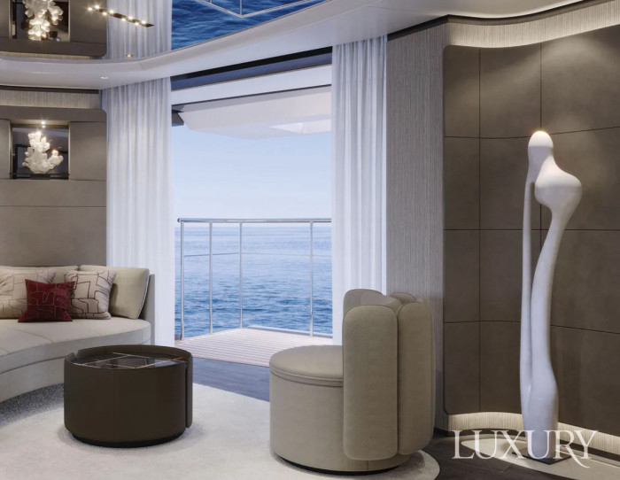 요트 건축가 에스펜 외이노Espen Øino가 외관을, 인테리어 디자이너 프랑수아 주레티François Zuretti가 실내를 꾸민 베네티Benetti의 ‘프로젝트 라이프’는 바다 위 삶의 방식을 재정의한다. 요트의 자랑거리는 270㎡ 규모의 수영장 ‘비치 에어리어Beach Area’다. 삼면을 개방해 실내외 경계를 허물었고, 투명한 수영장 바닥을 통해 햇살이 비치는 아래층에선 몰입적 해상 경험을 할 수 있다. 흥미롭게도 이곳은 낮에는 수상 스포츠와 일광욕의 무대가 되고, 밤이면 은은한 조명 아래 사교의 장으로 변모한다고. 더욱이 메인 살롱은 천장에서 바닥까지 이어지는 파노라믹 글라스로 바다를 끌어들이며, 112㎡의 공간을 절제된 조명과 차분한 색감으로 채워 깊이 있는 분위기를 만들어낸다. 혹 혼자만의 시간이 필요하다면, 유리로 둘러싸인 스카이라운지, 프라이빗 덱, 맞춤형 서재를 갖춘 98㎡의 오너 스위트에 들어가면 된다.