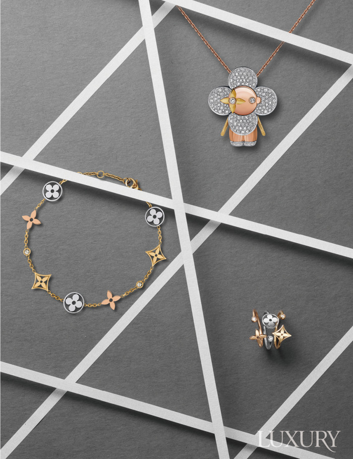 앙증맞은 비비엔의 형상을 형형색색의 골드와 다이아몬드로 표현한 ‘비비엔’ 라지 펜던트 네크리스. 펜던트 뒷면에는 잠금 핀이 있어 브로치로도 활용 가능하다. 메종을 상징하는 모노그램 플라워 모티프를 적용한 ‘이딜 블라썸’ 브레이슬릿은 3가지 색상의 골드를 사용해 다채로운 아름다움을 선사한다. ‘이딜 블라썸’ 링은 옐로·화이트·핑크 골드로 이루어진 오픈 링을 자유롭게 레이어드할 수 있어 스타일링의 재미를 더한다.