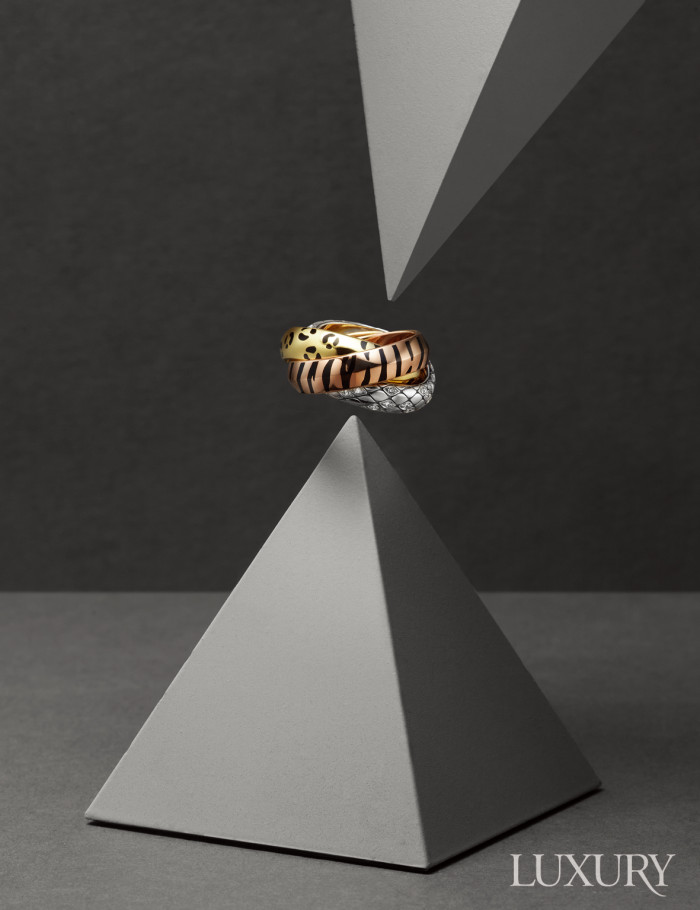 1924년 탄생한 ‘트리니티’ 링에 동물 모티프를 가미했다. 팬더, 호랑이, 뱀을 상징하는 패턴을 옐로, 핑크, 화이트 골드 링에 각각 더해 생명력을 불어넣었다. 정교한 블랙 래커 모티프는 장인이 수작업으로 완성했으며, ‘사우전드 라인’ 기법의 파베 세팅 기법을 적용해 영롱한 광채를 자랑한다.