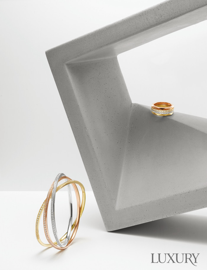 무한히 이어지는 스파이럴 형태의 브레이슬릿 3개를 결합한 ‘트리플 스파이럴’ 브레이슬릿. 화이트·옐로·핑크 골드 위에 총 7.65캐럿의 다이아몬드를 촘촘하게 수놓았다. 골드의 색감이 풍성해 보이도록 패싯 커팅하고 그 위에 다이아몬드를 파베 세팅한 ‘로렌스 그라프 시그니처’ 링. 3가지 골드를 결합해 한층 볼드한 매력을 자아낸다.