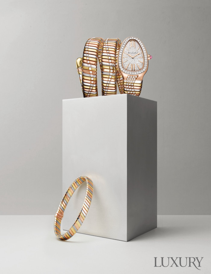 불가리의 상징적인 2가지 컬렉션을 한데 결합한 ‘세르펜티 투보가스 인피니티’ 워치. 뱀의 우아한 곡선을 3가지 색의 골드와 다이아몬드로 표현했다. 다이얼과 베젤 그리고 브레이슬릿에 총 4.25캐럿 브릴리언트 컷 다이아몬드를 세팅해 화려한 광채를 선사한다. ‘투보가스’ 브레이슬릿은 간결한 실루엣 덕분에 삼색 골드의 조화가 한층 돋보인다.