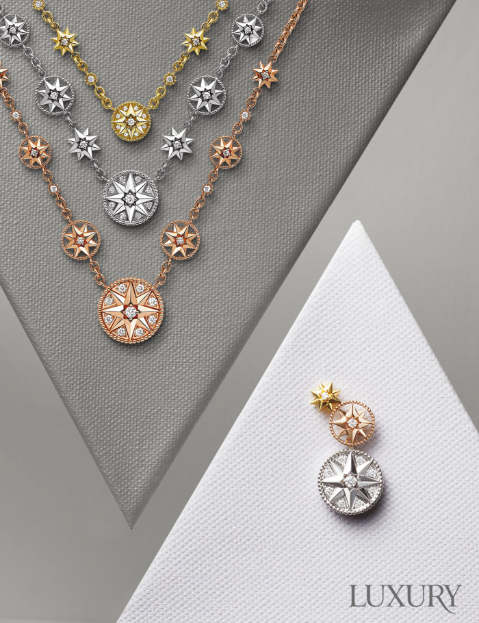 별과 바람장미 모티프로 완성한 ‘로즈 드 방’ 컬렉션의 네크리스와 싱글 이어링. 네크리스는 3가지 컬러의 골드 네크리스를 하나로 연결해 강렬한 존재감을 드러낸다. 싱글 이어링은 형태와 크기가 다른 모티프가 어우러져 경쾌한 리듬감을 자아내는데 특히 화이트 골드 펜던트는 다이아몬드 파베 세팅 면과 모티프를 장식한 면을 자유롭게 연출할 수 있는 리버서블 디자인이 특징이다.