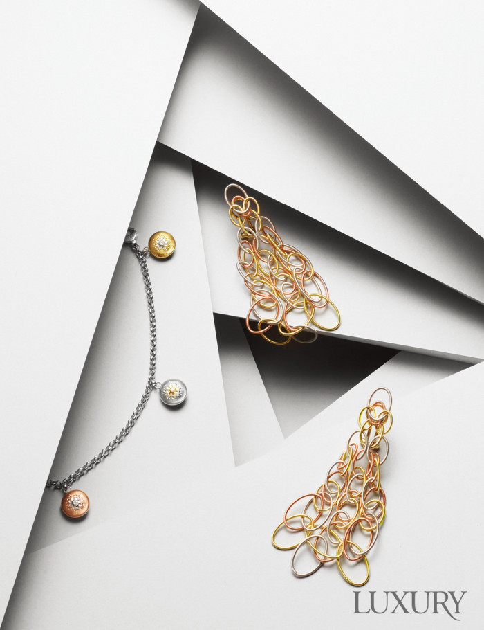 골드 표면에 촘촘하게 인그레이빙한 리가토Rigato 기법이 돋보이는 ‘마크리 클래시카’ 브레이슬릿. 다이아몬드를 세팅한 옐로·화이트·핑크 골드 펜던트 3개의 균형미가 조화롭다. 독창적인 골든 스레드 공예 기법으로 기하학적 링의 흐름을 표현한 ‘하와이’ 컬렉션 이어링. 삼색 골드를 사용해 역동적으로 완성했다.