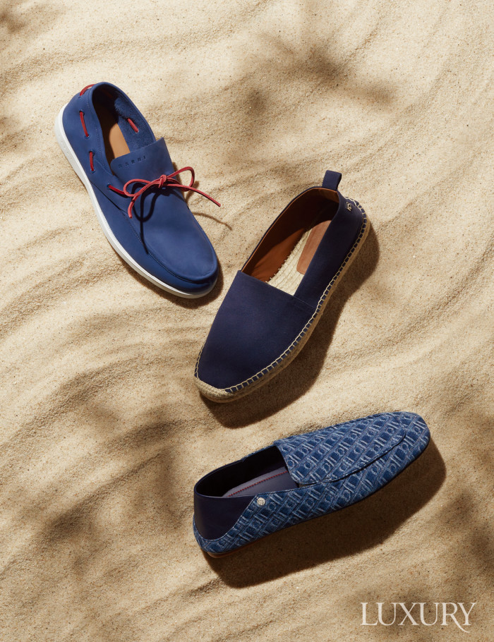 블루 레더, 화이트 아웃솔, 레드 스트랩의 색 조합이 경쾌한 누벅 소재 보트 슈즈는 마르니. 화이트 쇼츠와 함께 매치하면 여유로운 바캉스 룩을 연출할 수 있다. 무더위와 습기에 강한 서머 슈즈의 대표 주자인 에스파드리유. 짚으로 만든 아웃솔이 특징이며, 러버솔을 덧대어 내구성을 높였다. 랄프 로렌 퍼플 라벨. 여행지에 챙겨 가기 좋은 가벼운 데님 소재의 드라이빙 슈즈. 뒤꿈치를 접어서 신을 수 있는 타입이라 활용도가 높다. 페라가모.