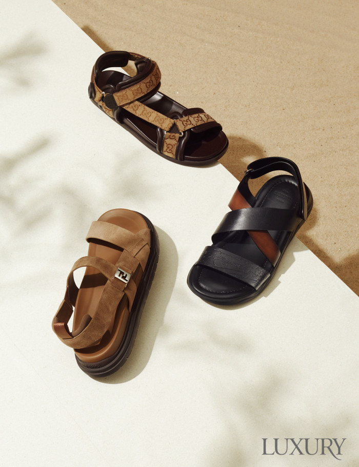 브랜드의 아이코닉한 GG 로고 패턴을 가미한 스트랩 샌들은 구찌. 스트랩 안쪽에 패디드 처리를 해 발등을 부드럽게 감싸는 게 장점이다. 블랙과 브라운 레더를 교차한 외관이 특징인 레더 샌들. 인솔에는 폭신한 레더 소재를 접목했고 아웃솔에는 가벼운 러버솔을 매치해 편안한 착화감을 선사한다. 벨루티. 우아한 샌드 컬러의 스웨이드 소재 샌들. 발뒤꿈치를 보호하기 위해 스트랩 부분에 쿠셔닝 소재를 더했다. 펜디.
