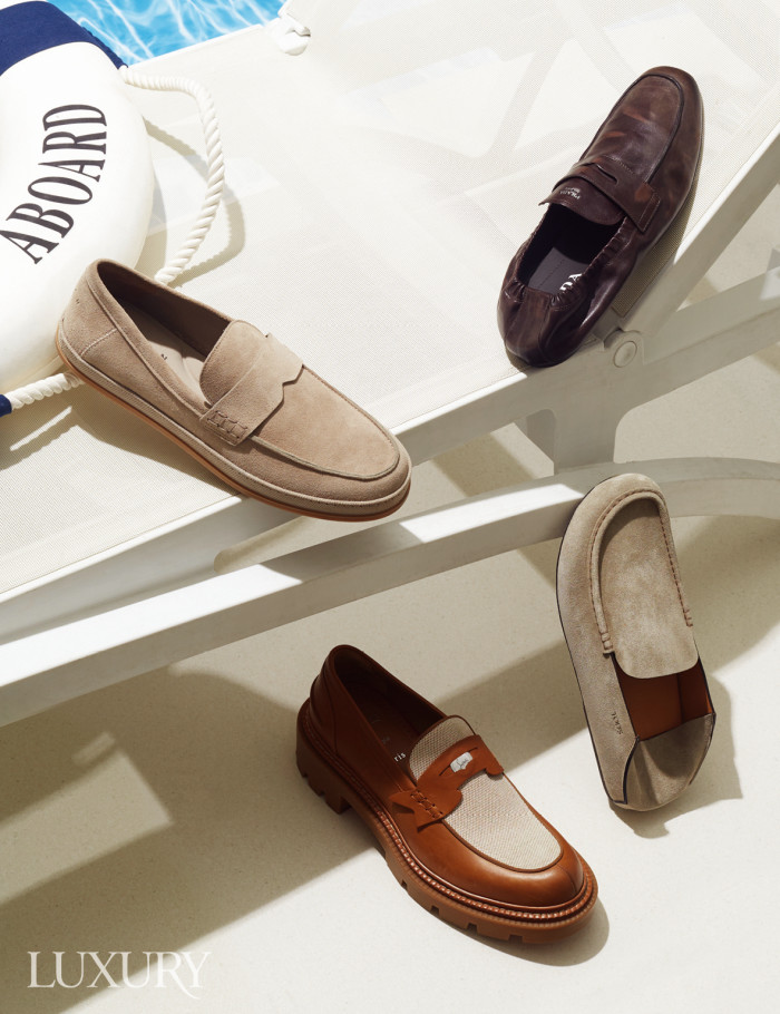 해변의 모래를 연상시키는 베이지 컬러의 스웨이드 로퍼. 메모리폼 인솔을 적용해 편안한 착화감을 자랑한다. 호간. 빈티지한 가죽 질감이 멋스러운 레더 로퍼는 프라다. 발볼이 넓은 타입도 편안하게 신을 수 있는 둥근 라스트의 로퍼. 슬리퍼처럼 신을 수 있도록 설계한 것이 특징이다. 토즈. 캐주얼한 무드를 자아내는 페니 로퍼는 크리스찬 루부탱.