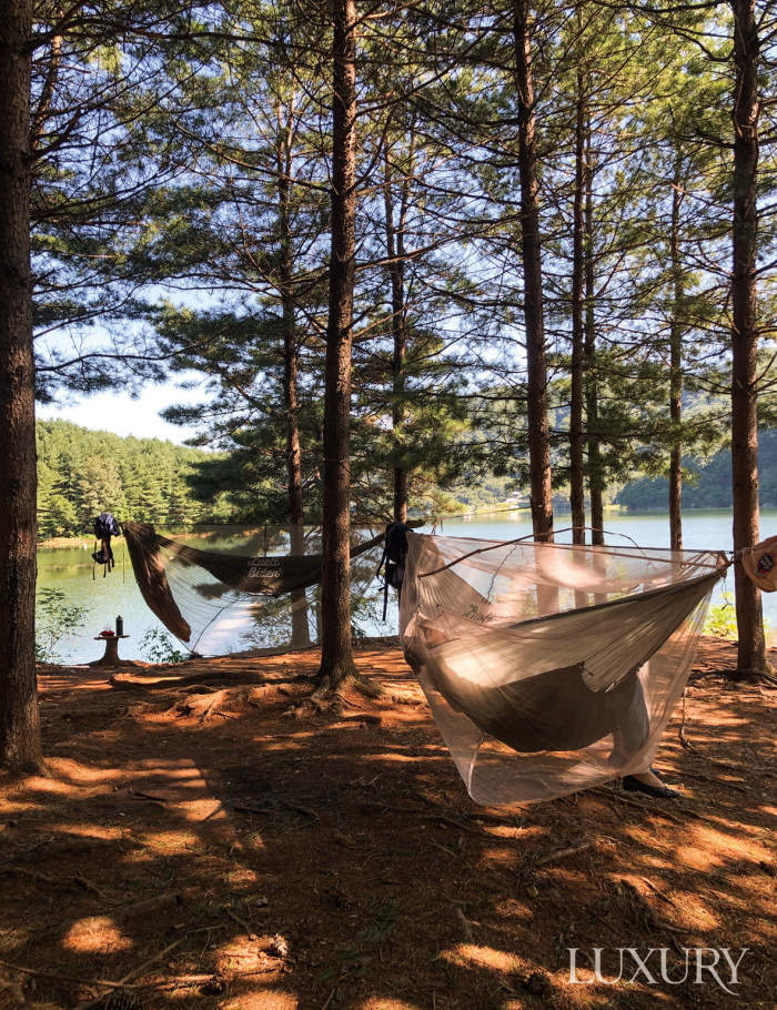춘천 호숫가 옆 잣나무 숲 노지에서 해먹 캠핑을 즐기곤 했다.