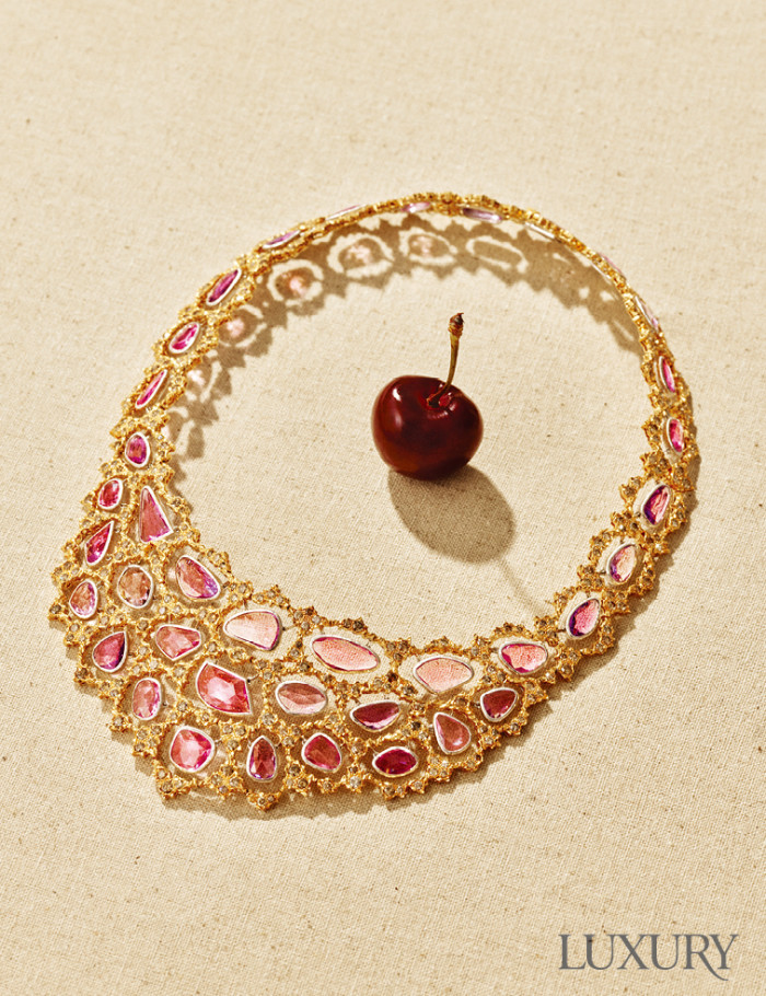 옐로 골드에 37개의 핑크 사파이어를 장식한 ‘유니카’ 네크리스는 부첼라티.