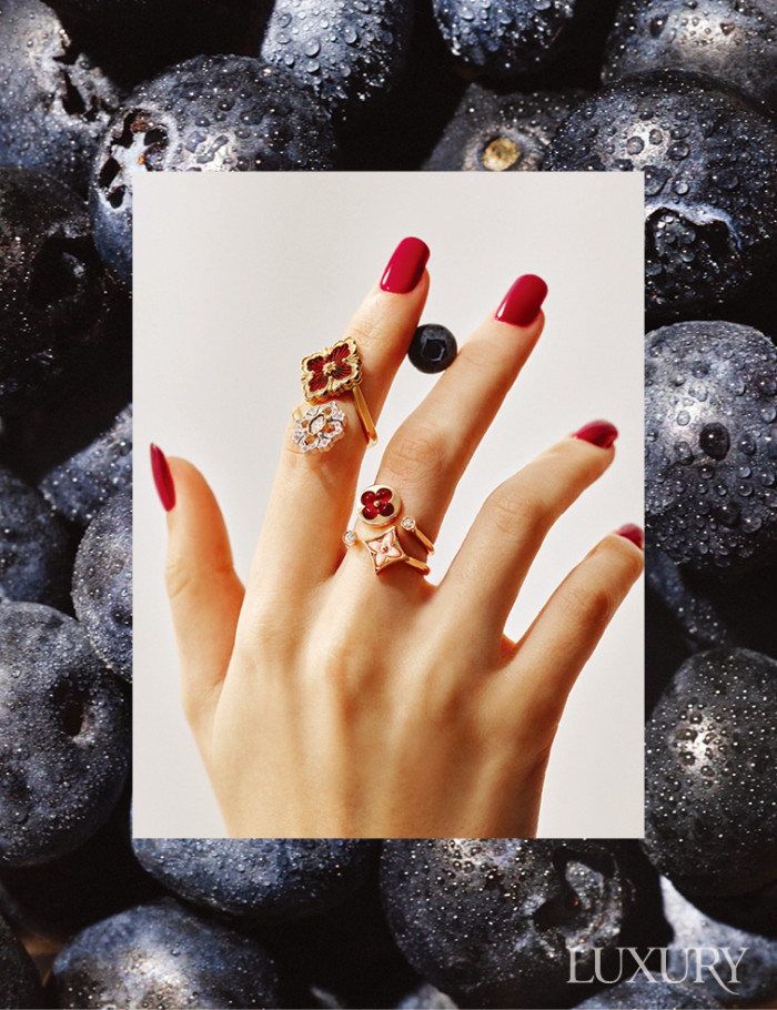 르네상스와 베네치아 고딕 예술 양식을 담은 검지의 ‘오페라 튤레’ 링은 부첼라티. 카닐리언 스톤을 모노그램 플라워 모양으로 조각한 중지의 ‘컬러 블라썸 미니 썬’ 링과 화이트 자개에 다이아몬드로 포인트를 준 ‘컬러 블라썸 미니 스타’ 링 모두 루이 비통.
