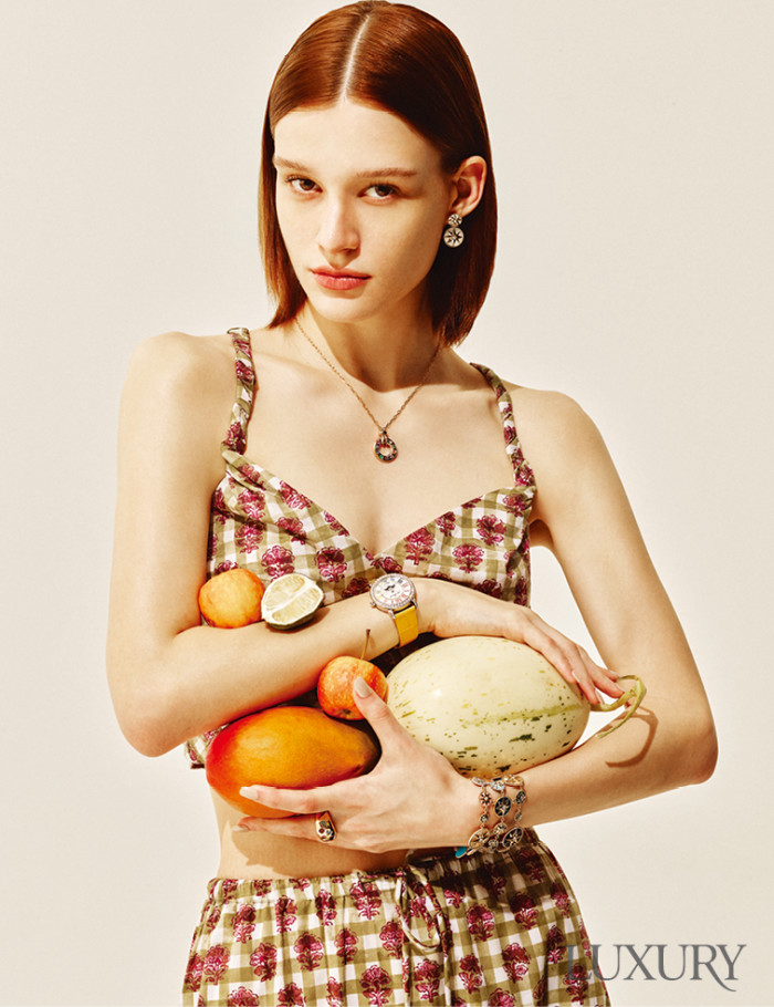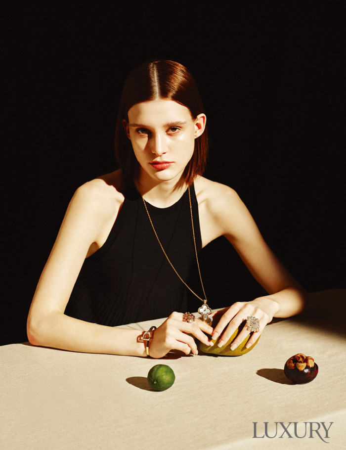 롱 네크리스 형태의 ‘알함브라 시크릿’ 펜던트 워치는 반클리프 아펠. 강렬한 태양빛을 표현한 오른손 검지의 ‘비 드 쇼메’ 링은 쇼메. 꽃잎이 내려앉은 모습에서 영감 받은 왼손 약지의 ‘쎄뻥 보헴 빈티지’ 링은 부쉐론. 다이아몬드를 파베 세팅한 로즈 골드 ‘이퀘스트리언 파베 다이아몬드 더블 스터럽’ 뱅글은 랄프 로렌. 슬리브리스 원피스는 스포트막스.