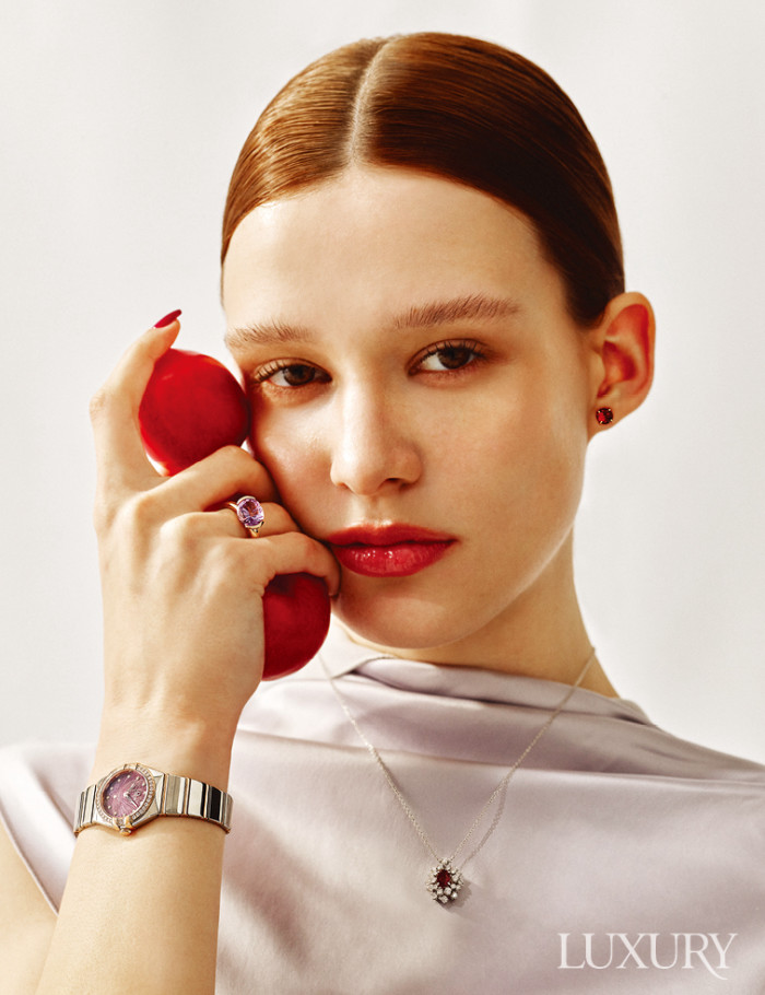 자주색의 스터드 셰이프가 특징인 ‘리파인드 리벨리온’ 가닛 이어링과 보랏빛 광채가 영롱하게 빛나는 ‘루미노’ 자수정 링은 타사키. 여성의 강인함을 상징하는 동명의 식물에서 영감받은 ‘미모사’ 네크리스는 다미아니. 금속 기판에 전기적 에너지를 사용해 패턴을 새긴 보라색 다이얼이 특징인 ‘컨스텔레이션’ 워치는 오메가.