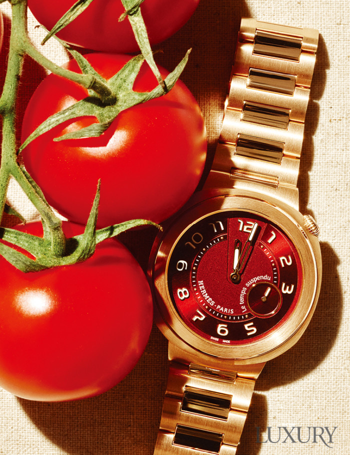 8시 방향의 푸시버튼을 누르면 시·분침이 12시 방향에 모여 멈추는 ‘에르메스 컷 르 땅 서스팡뒤’ 워치는 에르메스.