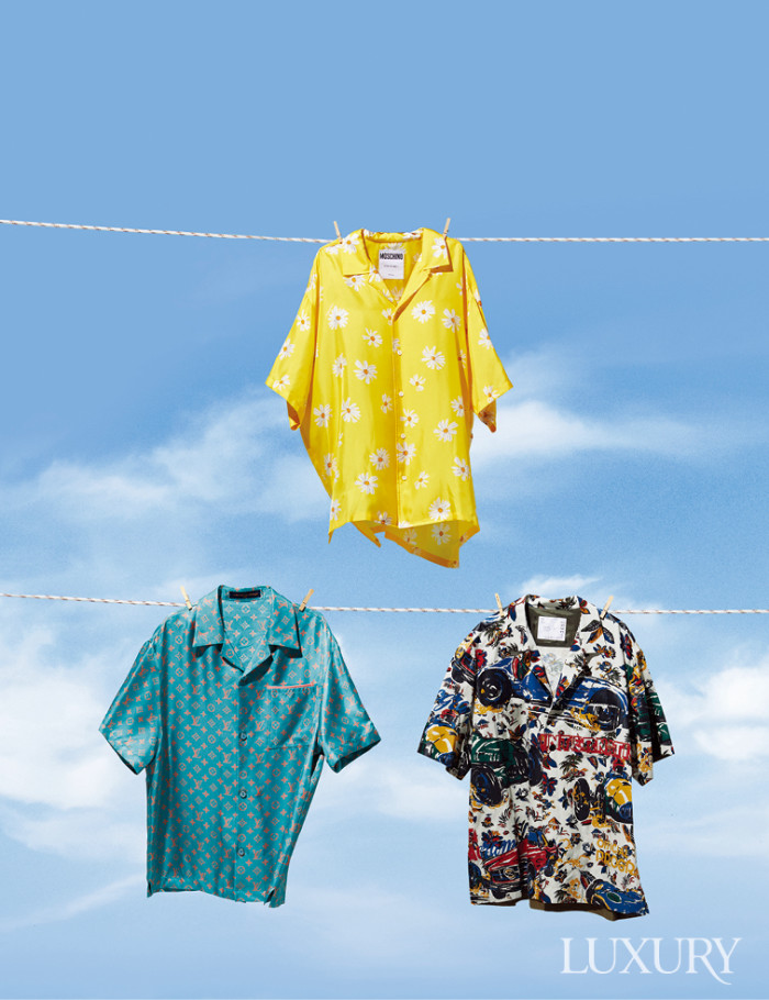 (시계방향으로) 화사한 옐로 컬러에 플라워 패턴을 가미한 오픈 칼라 셔츠. 생기 넘치는 여름 무드를 느낄 수 있다. 모스키노.