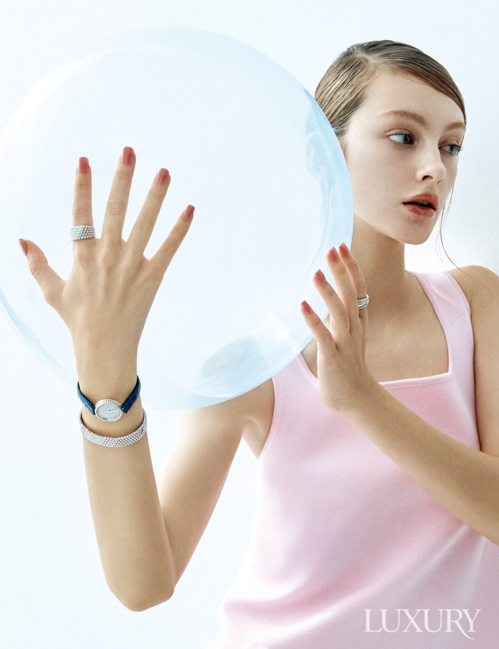 골드 비즈가 화려한 빛을 발하는 ‘뻬를리 골드 비즈 후프’ 스몰 이어링, 2개의 링이 교차된 것처럼 디자인한 왼손의 ‘뻬를리 다이아몬드 듀오’ 화이트 골드 링, 5개 라인 위에 뻬를리 비즈와 다이아몬드를 세팅한 오른손의 ‘뻬를리 다이아몬드’ 화이트 골드 링. 다이얼에 다이아몬드를 스노 세팅한 케이스 지름 23mm의 ‘뻬를리’ 워치, 5개 라인 위에 뻬를리 비즈와 총 2.01캐럿의 다이아몬드를 장식한 ‘뻬를리 다이아몬드’ 브레이슬릿 모두 반클리프 아펠.