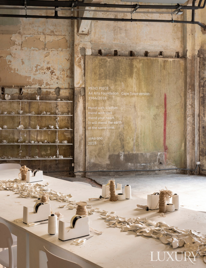 전시 . 참가자가 깨진 도자기 파편을 수리하도록 했는데, 이는 치유의 개념으로 집단 명상과