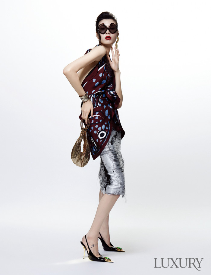 물고기 프린트 홀터넥 블라우스는 보테가 베네타. 원단의 실을 러프하게 늘어뜨린 스커트는 포츠1961. 버그 아이 선글라스는 프라다. 구조적인 형태의 이어링은 에트로. 골드 뱅글은 샤넬. 메탈 메시 링 핸들 백은 베르사체. 그린 젬스톤을 세팅한 슬링백 펌프스는 생 로랑 by 안토니 바카렐로.