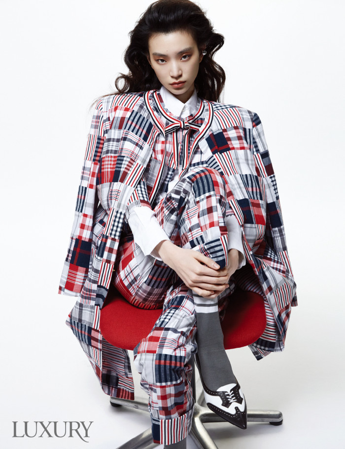 체크 패치워크 코트와 하프 슬리브 이너 재킷, 화이트 셔츠, 슬랙스, 그레이 삭스, 레이스업 디테일의 스틸레토 힐 모두 톰 브라운. 실버 이어 커프는 티링제이.