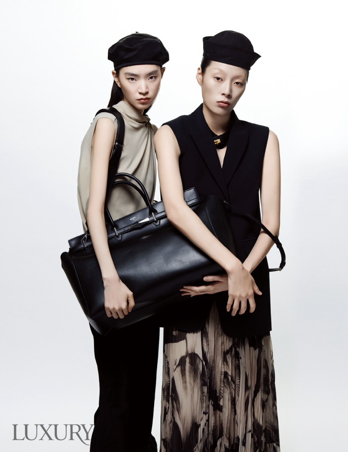 (왼쪽) 비대칭 슬리브리스 톱은 꾸레쥬. 벨벳 팬츠는 가연 리. 검정 베레모는 로로피아나. 벨트 디테일의 빅 토트백은 지미 추. (오른쪽) 오버사이즈 재킷 베스트와 자연스럽게 흐르는 실루엣의 플리츠스커트 모두 아뇨나. 머린 캡은 가연 리. 켈리 장식의 가죽 네크리스는 에르메스.
