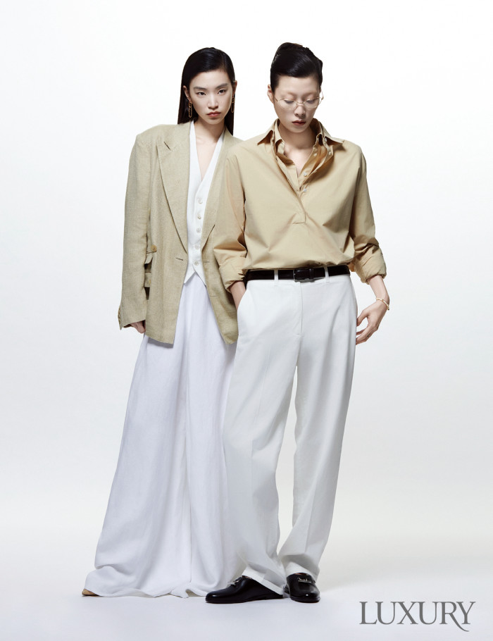 (왼쪽) 가벼운 리넨 소재의 재킷과 베스트, 와이드 팬츠, 펌프스 모두 랄프 로렌 컬렉션. 샹 당크르 모티프 이어링은 에르메스. (오른쪽) 2가지 하프 칼라 셔츠와 화이트 팬츠, 가죽 벨트 모두 더 로우. 금테 안경은 아르마일. 스터드 장식의 뱅글은 에르메스. T 바 로퍼는 맥퀸.