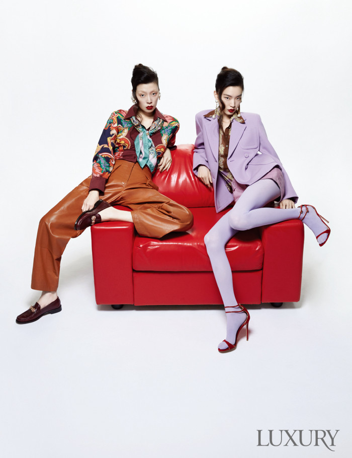 (왼쪽) 다채로운 색감의 페이즐리 패턴 셔츠와 실크 스카프 모두 에트로. 브라운 레더 팬츠는 에르메스. 플라워 이어링은 발렌티노 가라바니. 젬스톤 장식의 로퍼는 가브리엘라 허스트. (오른쪽) 라벤더 컬러 재킷과 플라워 프린트 블라우스, 쇼츠 모두 베르사체. 더블 스트랩 샌들은 지안비토 로시. 진주와 크리스털 장식의 드롭 이어링은 발렌티노 가라바니.