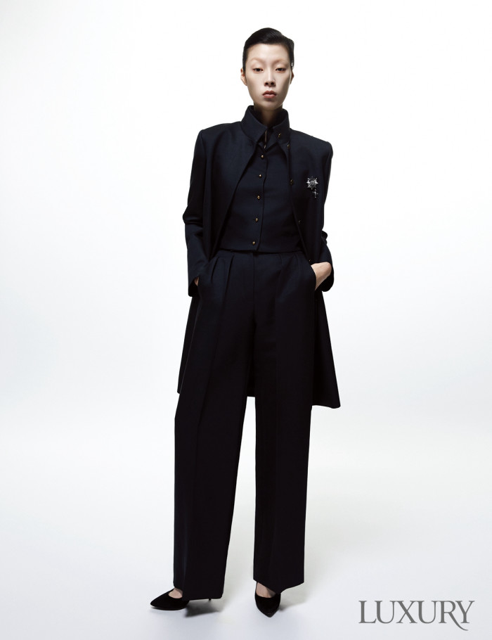 네이비블루 하이넥 코트와 이너 베스트, 스트레이트 핏 슬랙스 모두 로로피아나. 2가지 메탈 브로치 모두 티링제이. 골드 힐로 포인트를 준 펌프스는 톰포드.