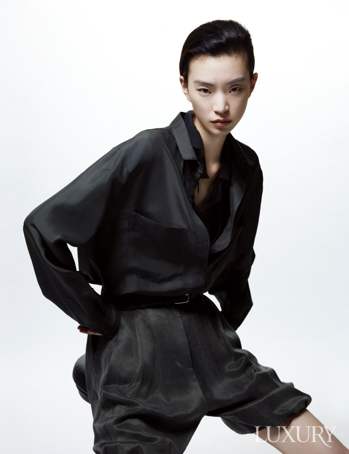 루스 핏 새틴 셔츠와 시스루 블라우스, 하프 펌프킨 팬츠 모두 조르지오 아르마니. 가죽 벨트는 더 로우.