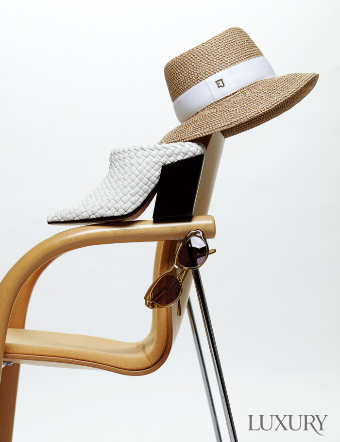 리본 밴딩 라피아 햇은 에릭자비츠. 인트레치아토 뮬은 보테가 베네타. 올리브 컬러 캐츠 아이 선글라스는 로에베.